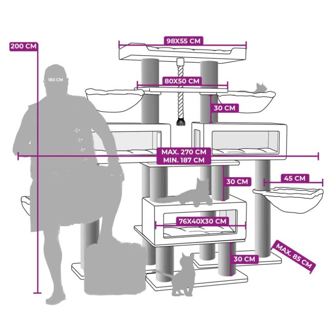 Met een hoogte van 200cm en breedte van 187cm kan jouw kat zich naar alle hartenlust uitleven. Genoeg mogelijkheden om te krabben en zo de nagels te scherp te houden. Natuurlijk in de hoop dat ze je gordijnen en bank heel houden 😉 Met 15cm beschikt de Alley over zeer dikke stammen om te krabben. Maar met maar liefst 16 krabpalen is er altijd ruimte genoeg om te krabben.