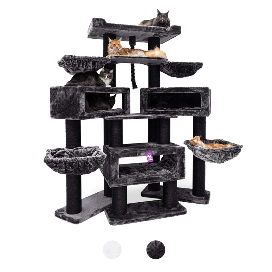 Met 6 plateaus en vier hangmatten geef je alles wat je kat nodig heeft. Met een gewicht van 108 kilo is dit ook echt wel één van de zwaardere krabpalen. De hangmatten kunnen een gewicht dragen tot wel 25 kilo. De losse kussentjes kan je wassen.