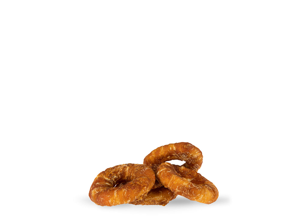 De gepofte ringen zijn een unieke kauw-beleving voor je hond. Stevige runderhuid rijkelijk omwikkeld met malse kip.