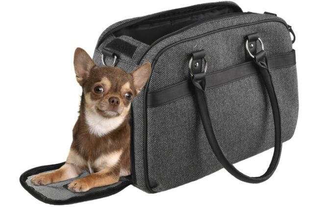 De tas is geschikt voor de kleinere honden en puppy’s tot circa 5 kilo.