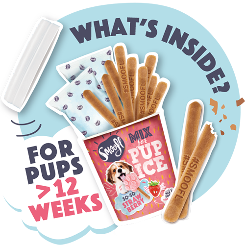 Smoofl aardbeimix voor Puppy is ideaal om makkelijk en snel je pup hondenijs te geven op warme dagen. Lekker verkoelend voor je hond en leuk om te geven!